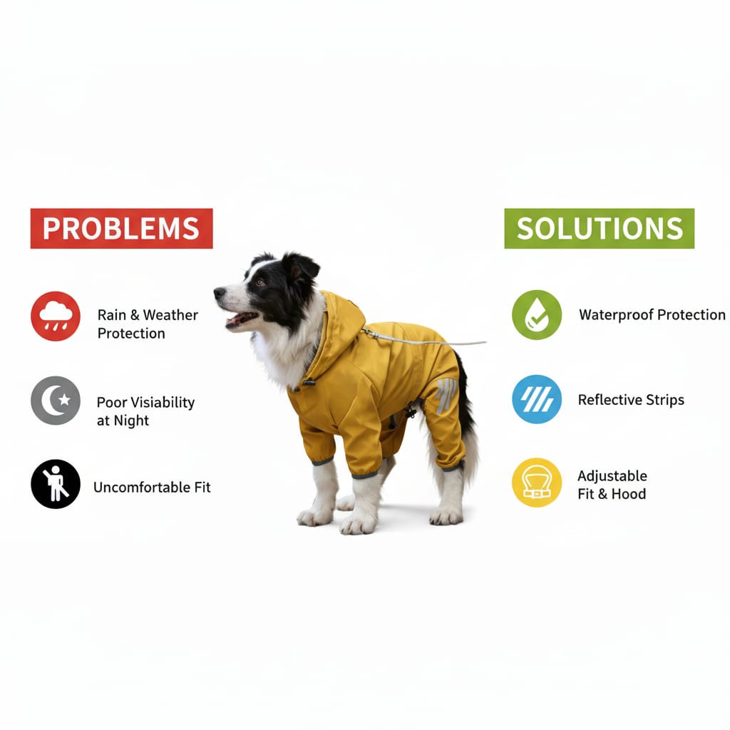 Getting wet in the rain isn't just uncomfortable for your dog — it can lead to skin irritation, fungal infections, and even colds. On top of that, walking your dog at night or in low-light rainy conditions can be dangerous without proper visibility. Standard pet jackets often fit poorly and cause discomfort. The Pet Raincoat solves all three problems in one smart design.