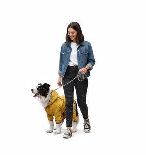 Simply slip the raincoat over your dog's body and adjust the straps for a snug, comfortable fit. Pull the hood up for extra head and neck protection in heavy rain. It is designed for easy on and off — no complicated buckles or fastenings. Just put it on before heading outside and remove it once you're back indoors. Wipe clean or hand wash after use and hang to dry.